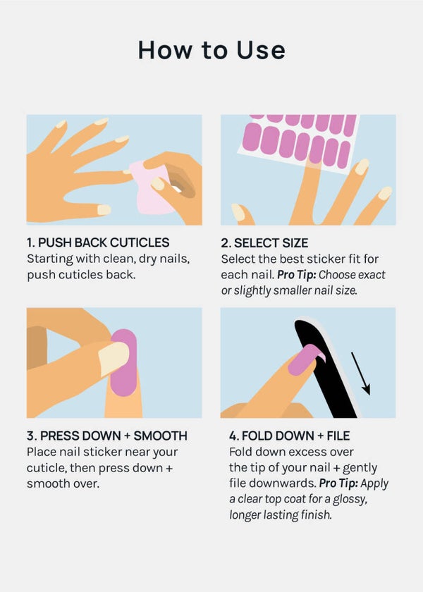 Bye-bye drying time! Create a perfect mani in minutes – just peel, stick, press + file!
