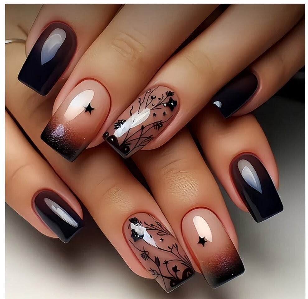 24pcs/Set Autumn-Winter Charcoal Black Glitter French Twigs Press-On Nails