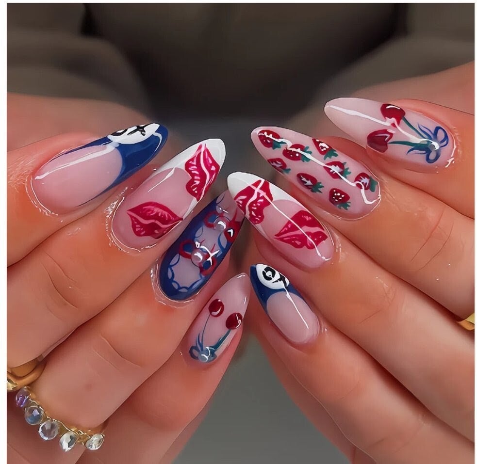 24pcs/Set Blue & White French Fruit And Lips Press-On Nails