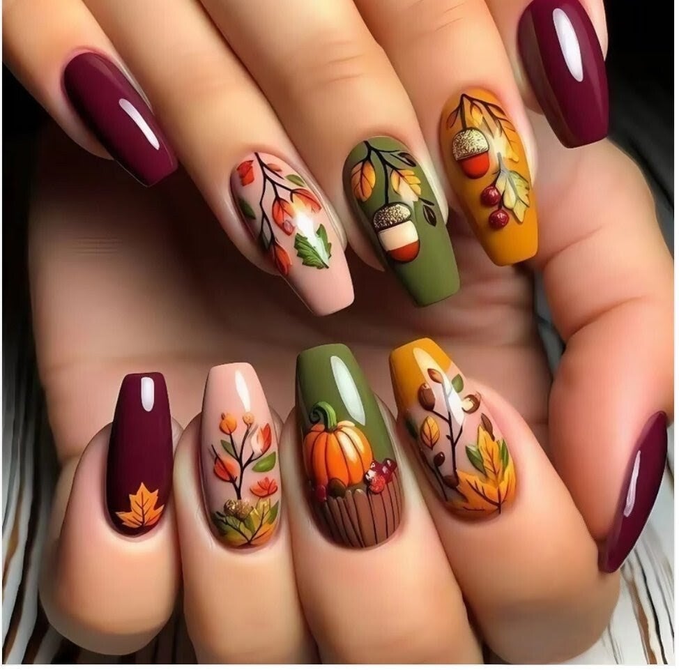 24pcs/Set Autumn Maple Leaves & Pumpkin Vines Press-On Nails