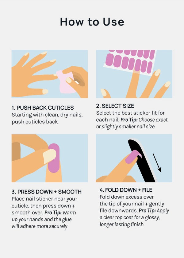 Get an easy mess-free manicure. Just peel, stick, press + file. No glue needed!